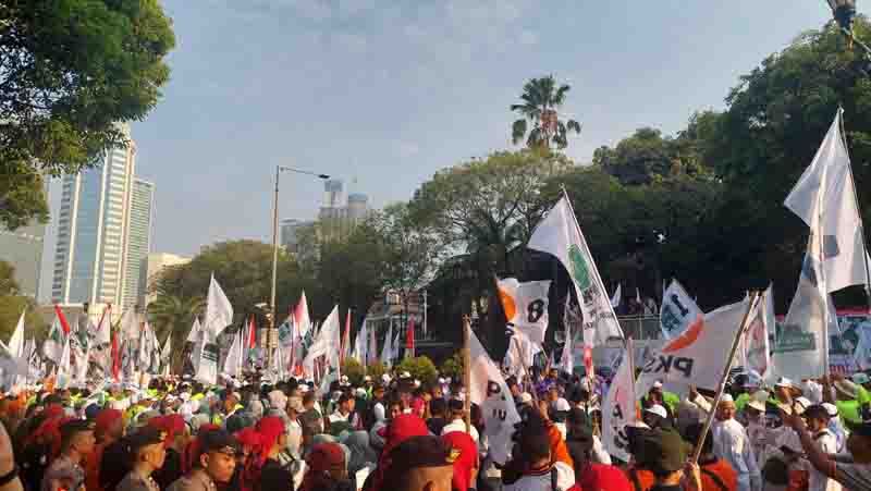 BACAKORAN.CO - Kamis 19/10 pagi ini, ribuan pendukung dari pasangan Capres dan Cawapres Anies Baswedan dan Muhaimin Iskandar (AMIN) terpantau memenuhi jalan depan kantor KPU Pusat yang berada di jalan Imam Bonjol Jakarta Pusat.