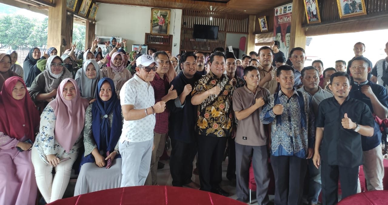 BAGI-BAGI : Sedikitnya 101 Pendamping PKH Banyuasin menerima uang dan hadphone yang di bagikan mantan Bupati Banyuasin Askolani Jasi. Tampak pendamping PKH Banyuasin foto bersama Askolani Jasi--