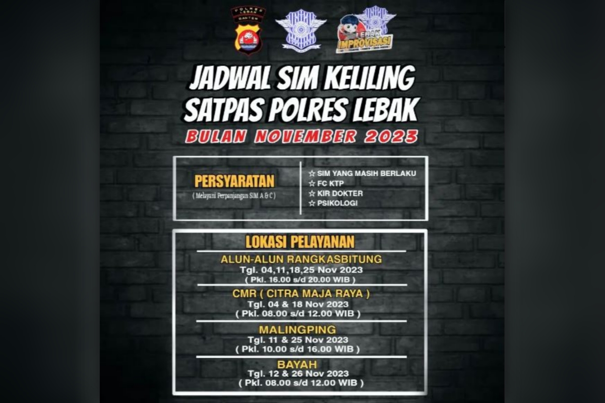 Berikut ini adalah informasi lengkap tentang jadwal, lokasi, persyaratan, dan biaya SIM keliling Lebak Banten hari ini.
