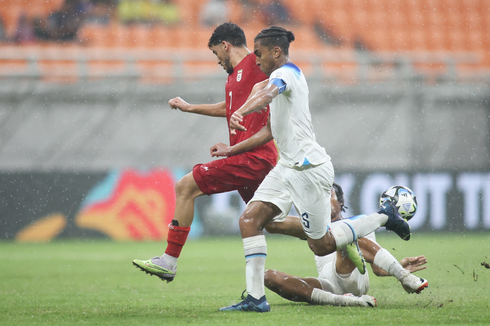 Finley McAllister berebut bola dengan pemain Iran U-17.-loc wcu17-
