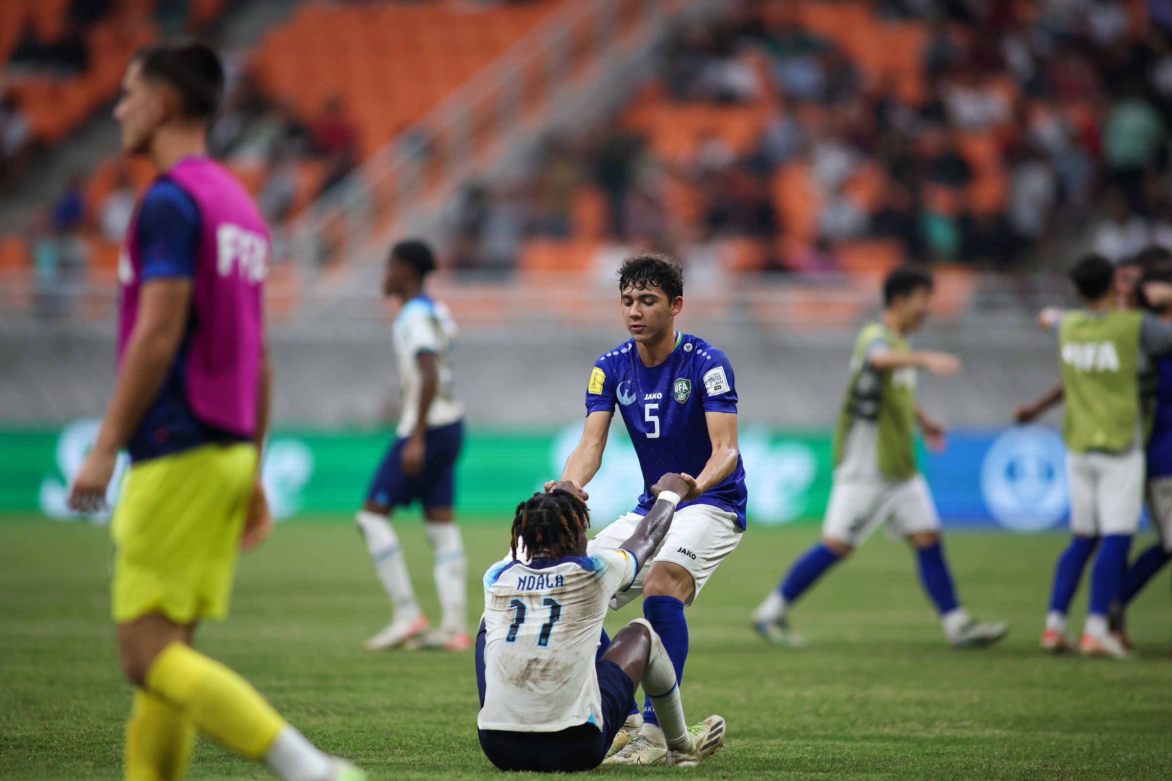 Pemain Uzbekistan U-17 memberikan semangat dengan membantu berdiri pemain Inggris. -loc wcu17-