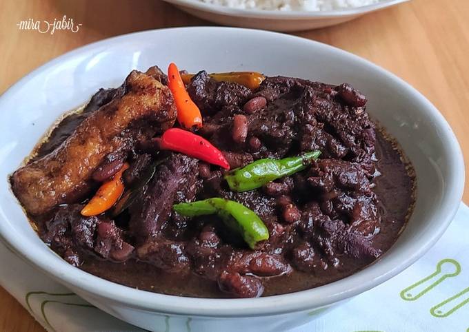 Brongkos memiliki kuah berwarna hitam yang terbuat dari santan yang dibumbui dengan kluwak.
