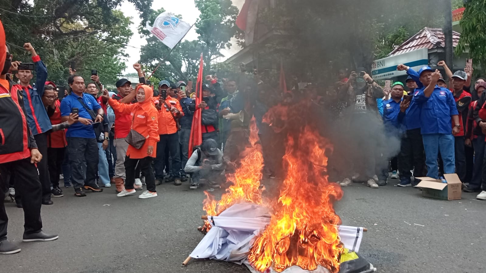 Sebelum membubarkan diri, para buruh menyuarakan protes mereka dengan membakar atribut buruh, termasuk keranda.