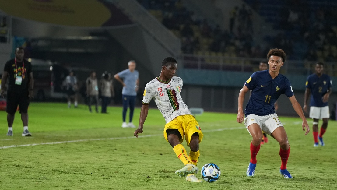 Pemain Prancis U-17 saat mempertahankan bola dari incaran pemain mali U-17.-loc wcu17-