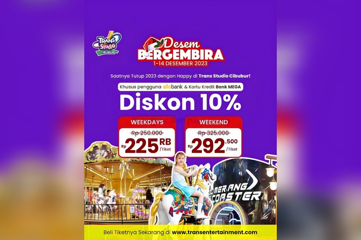 Nah, di bulan Desember yang penuh keceriaan, Trans Studio Cibubur memberikan promo DesemBERGEMBIRA yang berlaku dari tanggal 1 sampai 14 Desember 2023.
