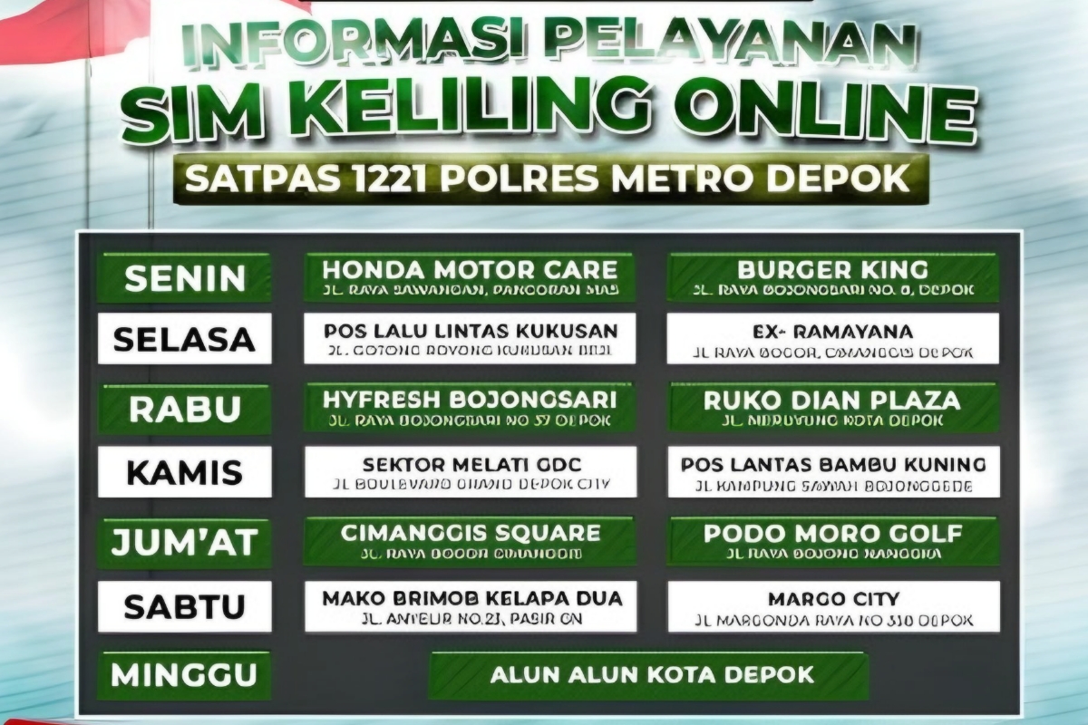 Untuk Lokasi SIM Keliling Depok hari ini tersedia di 2 lokasi pelayanan mobil SIM keliling di Depok, pada Sabtu 9 Desember 2023, kuylah simak: