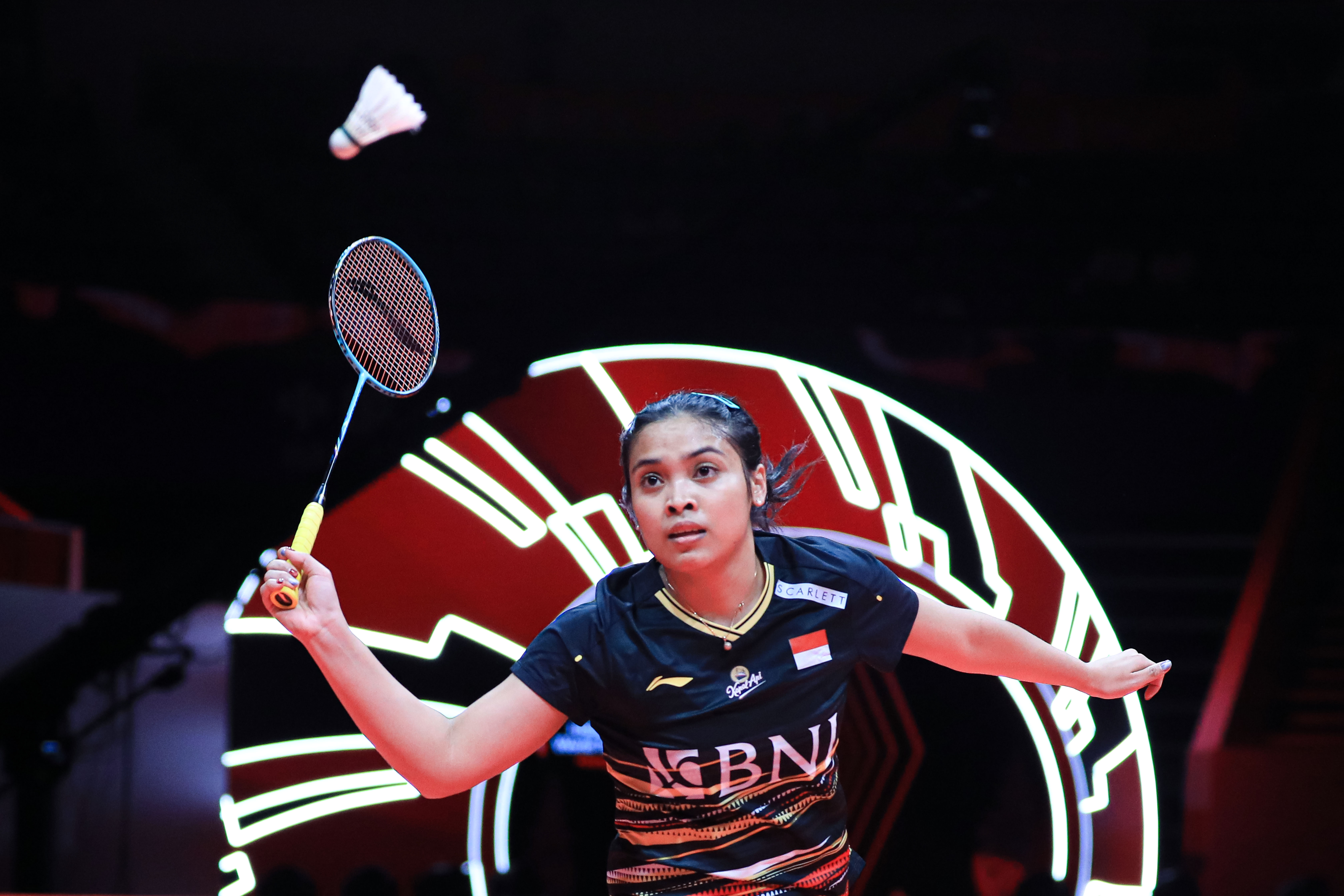 gregoria mariska tunjung sukses kemas kemenangan di laga terakhir grup a tunggal putri.-pbsi-