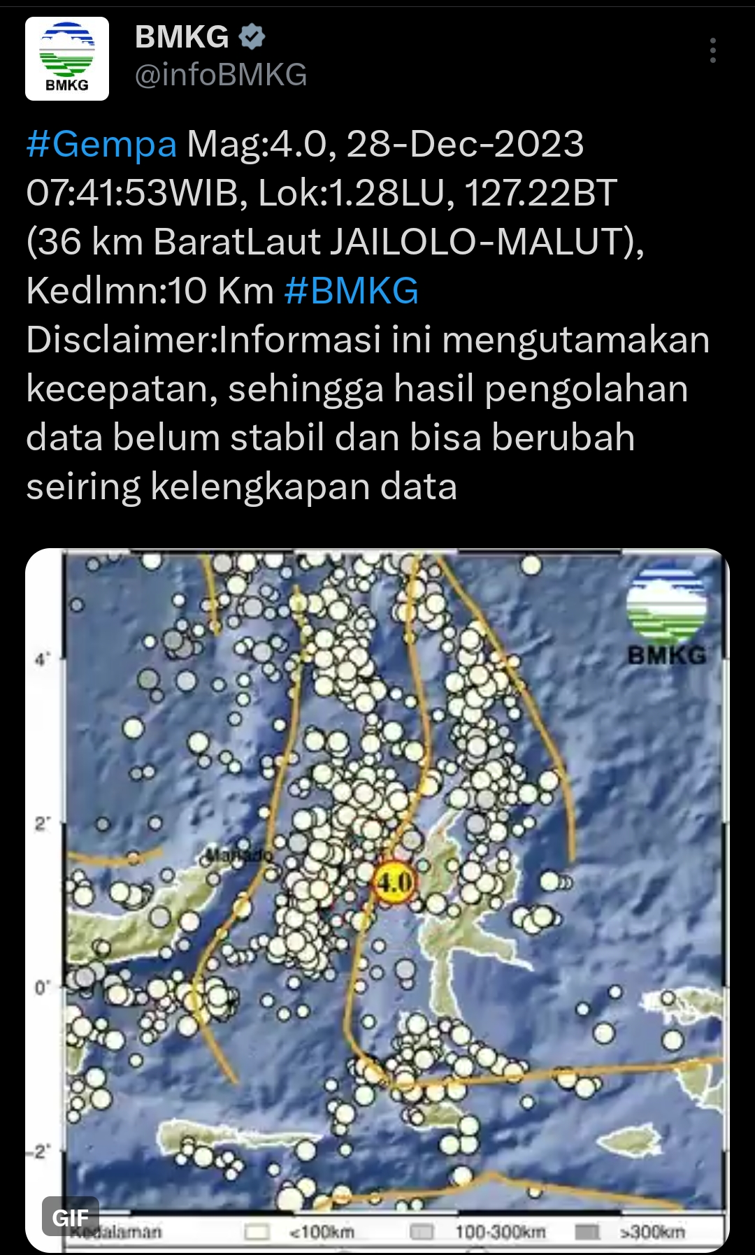 Informasi Gempa 4,0 M landa Jailolo Maluku Utara pagi ini 28 desember 2023--twitter@InfoBMKG