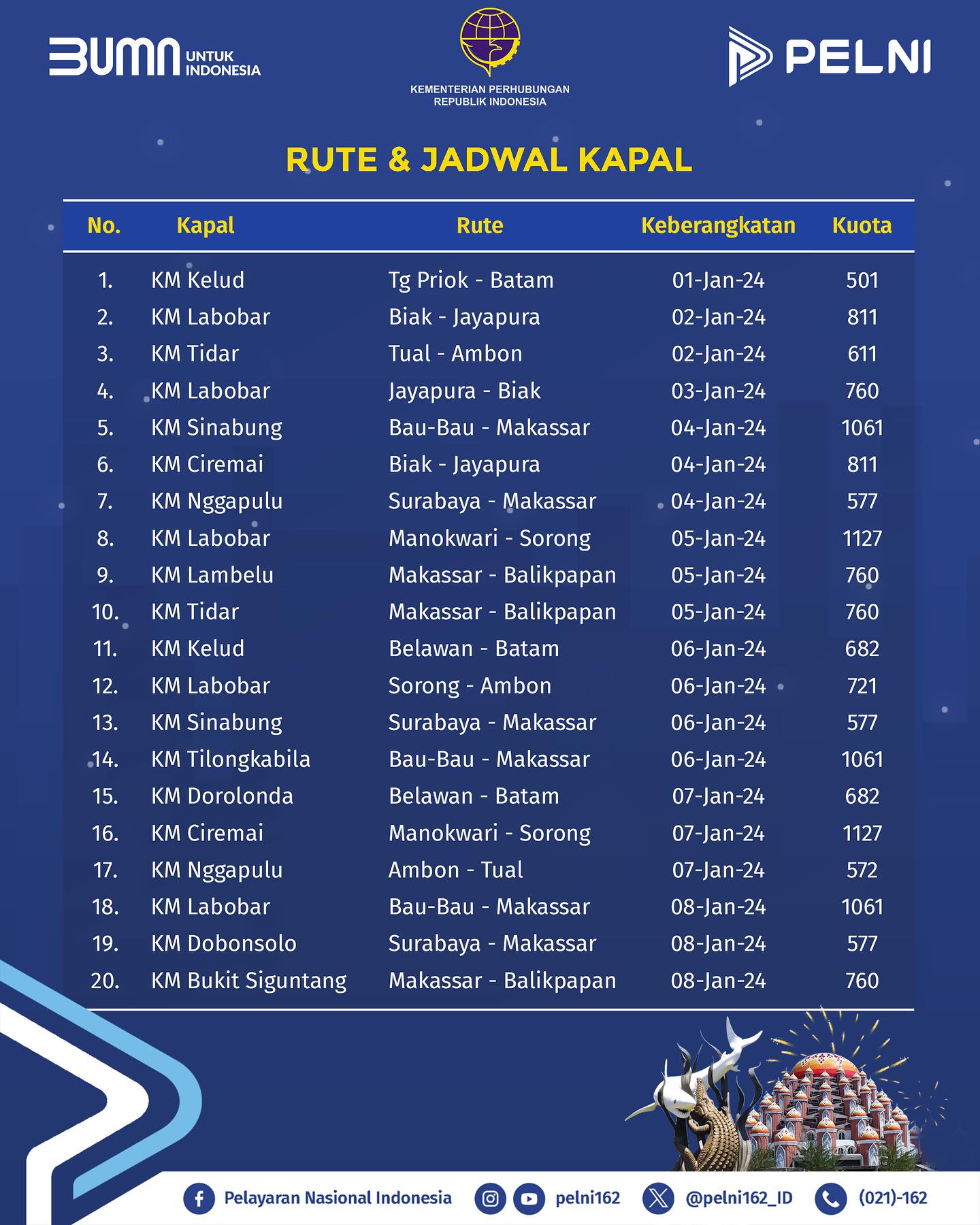 18. km labobar (bau-bau – makassar) keberangkatan 8 januari 2024, dengan kuota 1061 tiket.