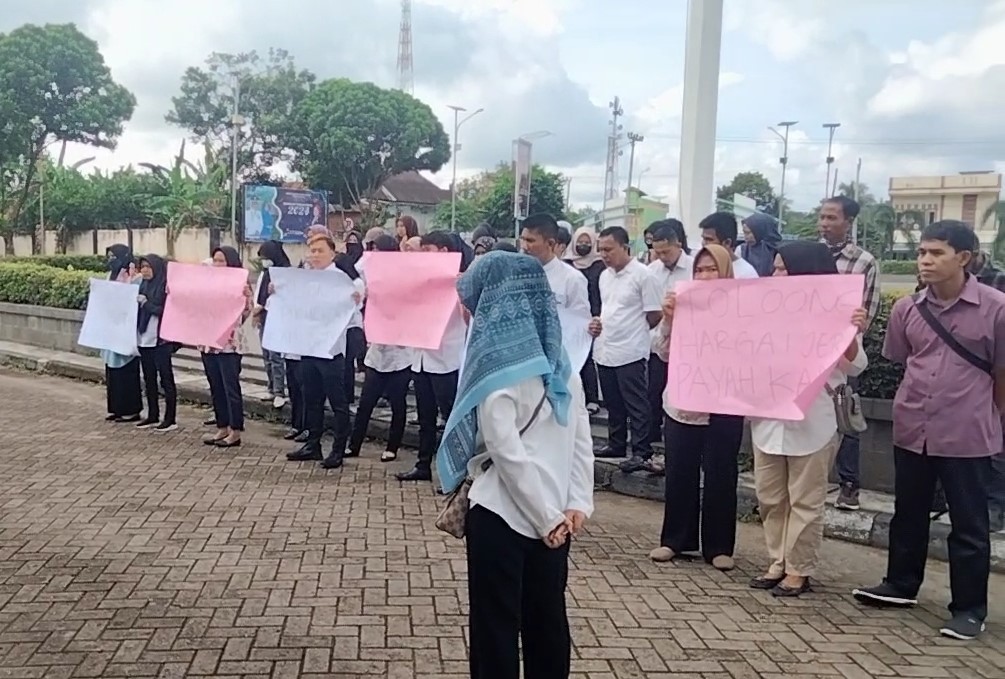 HONOR : Ratusan TKS Setda Kabupaten Empat Lawang gelar aksi tuntut pembayaran honor yang 6 bulan tertunda. (foto hendro/sumateraekspres.id)--