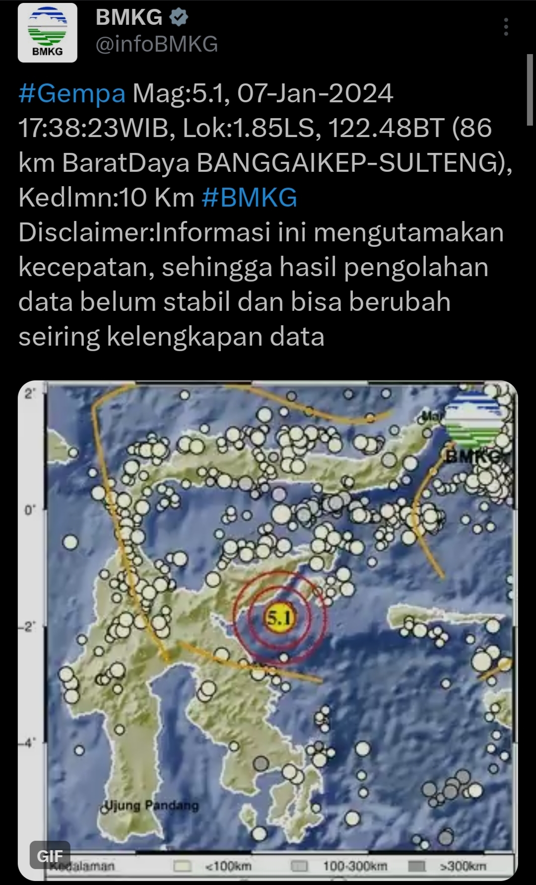 Informasi mengenai gempa hari ini di barat daya Banggai Kepulauan, Sulawesi Tengah disampaikan melalui aplikasi X (Twitter) resmi akun @infoBMKG.