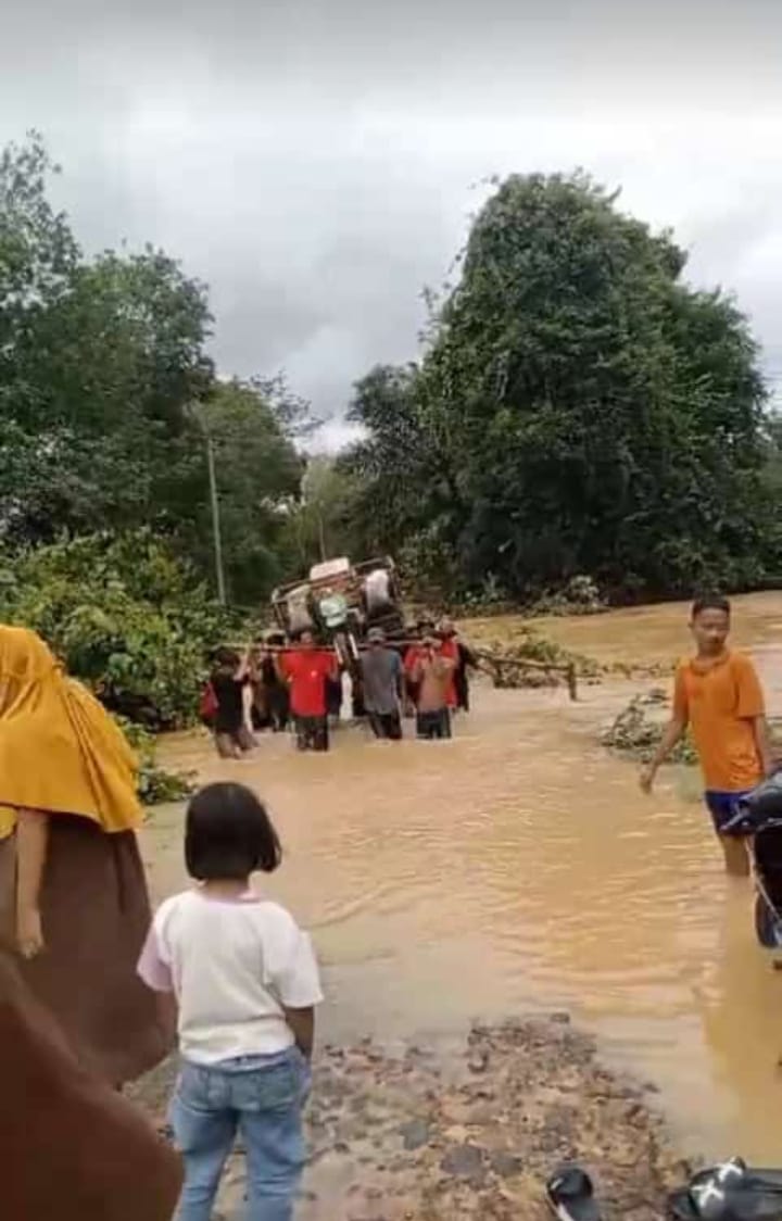"Ya air sungai Nau meluap di dekat jembatan. Tingginya air sungai membuat air menutupi jalan," ungkap Muslih Kades Cempaka Sakti.