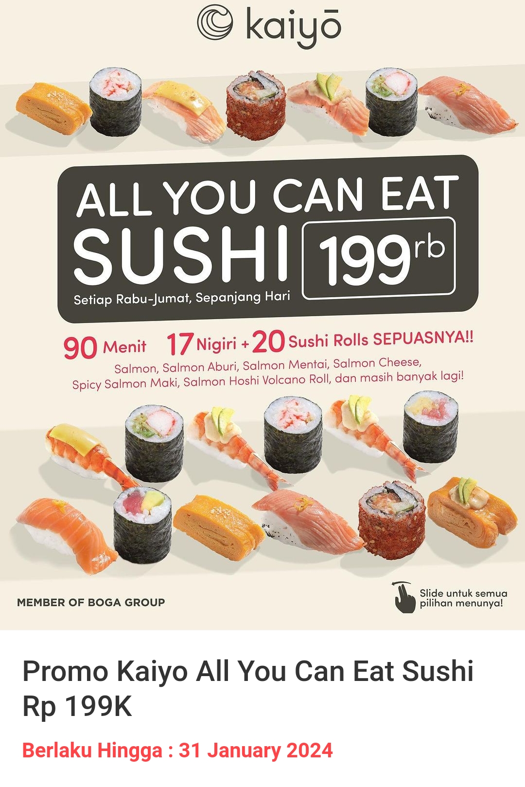 BACAKORAN.CO - Kabar gembira bagi pecinta sushi Kaiyo lagi ada promo cuma Rp 199 Ribu kamu bisa makan sepuasnya.
