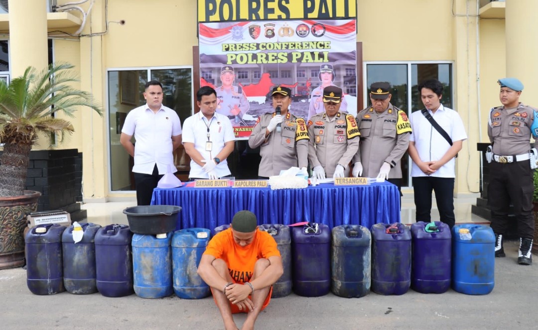 kapolres pali akbp khairu nasrudin sik mh didampingi kabag ops polres pali kompol hendro suwarno sh, kasi humas  akp ardiansyah sh dan kasat reskrim iptu yudhistira, strk sik menjelaskan, penangkapan terhadap terduga pelaku penimbunan itu terkait upaya penindakan pelaku penyebab kelangkaan bbm bersubsidi dan gas elpiji yang dilakukan pihak pertamina patra niaga regional sumbagsel.