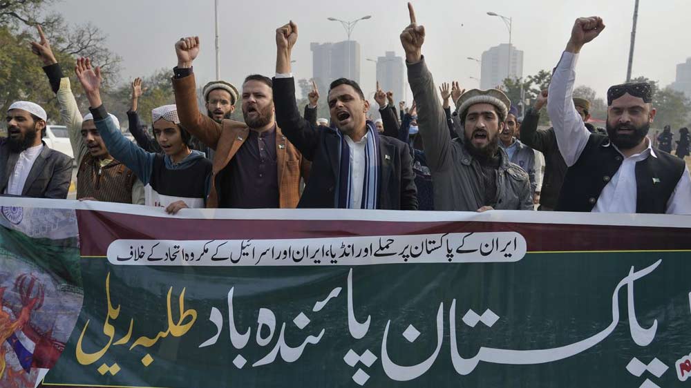 Anggota Muslim Talba Mahaz Pakistan meneriakkan slogan-slogan pada demonstrasi untuk mengutuk serangan Iran di daerah perbatasan Pakistan, di Islamabad, Pakistan, pada 18 Januari 2024. | Kredit Foto: AP--
