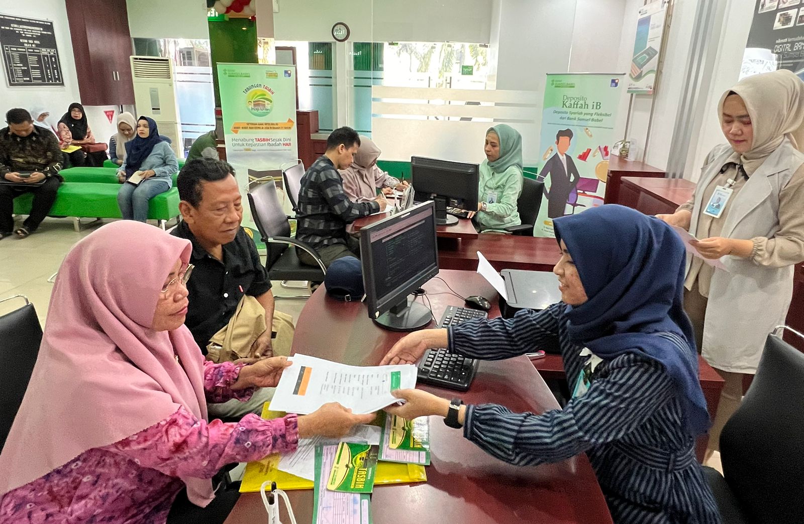 Terpantau para CJH Kota Palembang melakukan pelunasan di Bank Sumsel Babel Syariah dan Bank Syariah Indonesia .