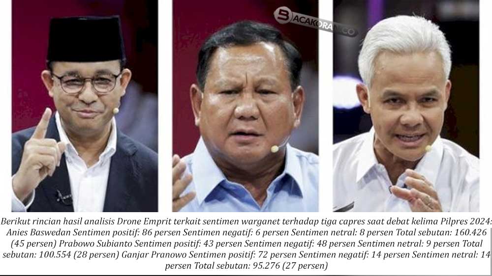 BACAKORAN.CO - Hasil analisis Drone Emprit mengungkapkan bahwa Anies Baswedan menjadi capres yang paling disukai oleh warganet di Twitter setelah debat kelima Pilpres 2024.