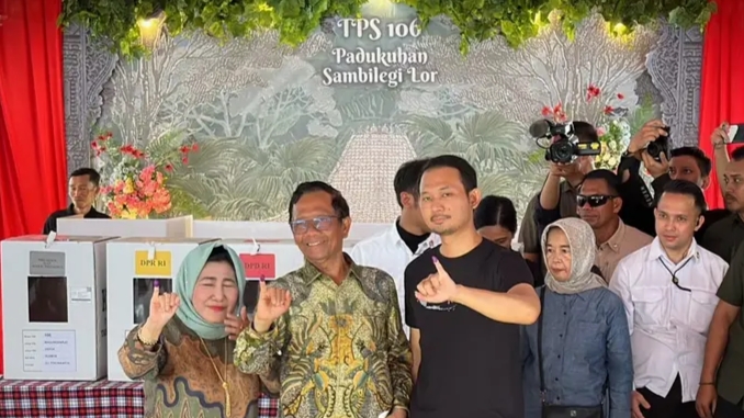 Calon wakil presiden nomor urut tiga Mahfud MD dan keluarga, menjadi orang pertama yang mencoblos di TPS 106 di Sleman Yogyakarta--Liputan6.com/Nanda Perdana Putra