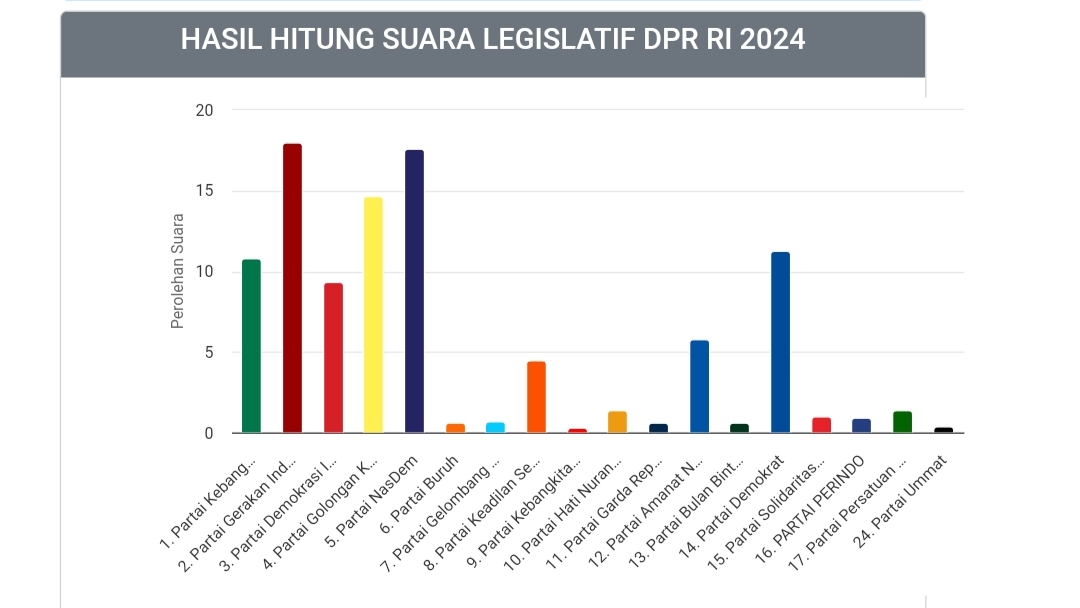 Dilansir bacakoran.co dari laman pemilu2024.kpu.go.id informasi resmi Komisi Pemilihan Umum (KPU) pada tanggal 22 Februari 2024 pukul 12:00 WIB. Dari total 14.205 Tempat Pemungutan Suara (TPS) yang telah masuk, sudah terhitung sebanyak 9.786 suara.