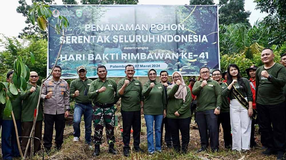 Palembang.BACAKORAN.CO - Pelaksana Harian (Plh) Sekretaris Daerah (Sekda) Provinsi Sumatera Selatan (Sumsel) Edward Candra bersama Inspektur Jenderal Kementerian Lingkungan Hidup dan Kehutanan (KLHK) RI, Laksmi Wijayanti serta Ketua DPRD Provinsi Sumsel R.A. Anita Noeringhati menanam 400 bibit pohon dalam rangka memperingati Hari Bakti Rimbawan ke -41.