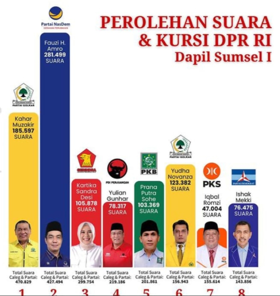 Di Dapil Sumsel I, suara Golkar mendominasi dengan 455.746 suara, sementara NasDem hanya memperoleh 396.024 suara.