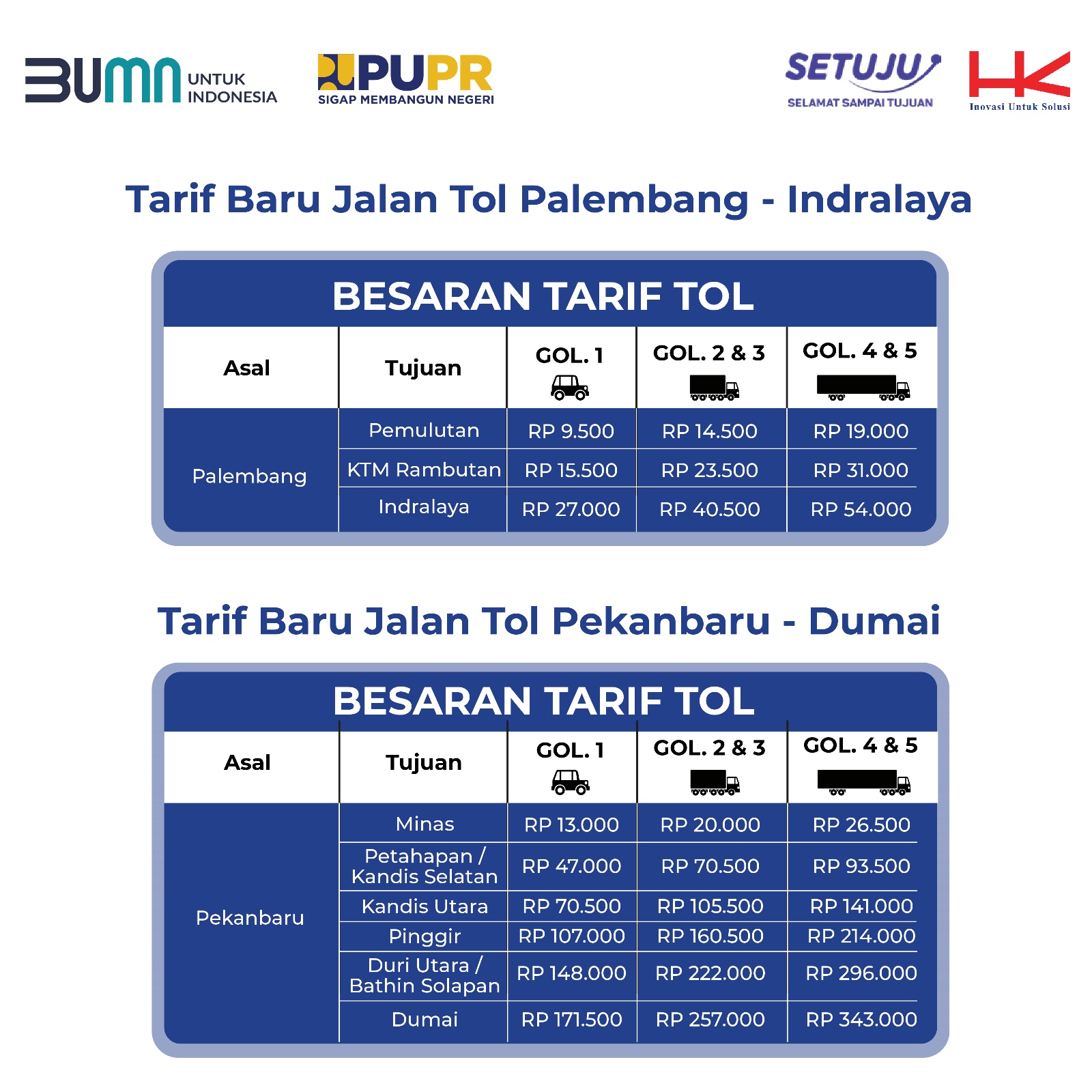 kemudian juga dan kepmen pupr nomor 415/kpts/m/2024 tentang penyesuaian tarif jalan tol pekanbaru - dumai, pt hutama karya (persero) (hutama karya) akan melakukan penyesuaian tarif pada kedua ruas tol tersebut pada 18 maret 2024 pukul 12.00 wib.
