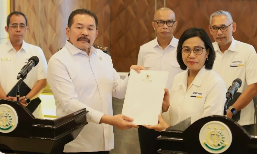 Dalam pertemuan tersebut, Sri Mulyani menyerahkan laporan secara langsung kepada Jaksa Agung Sanitiar Burhanuddin.