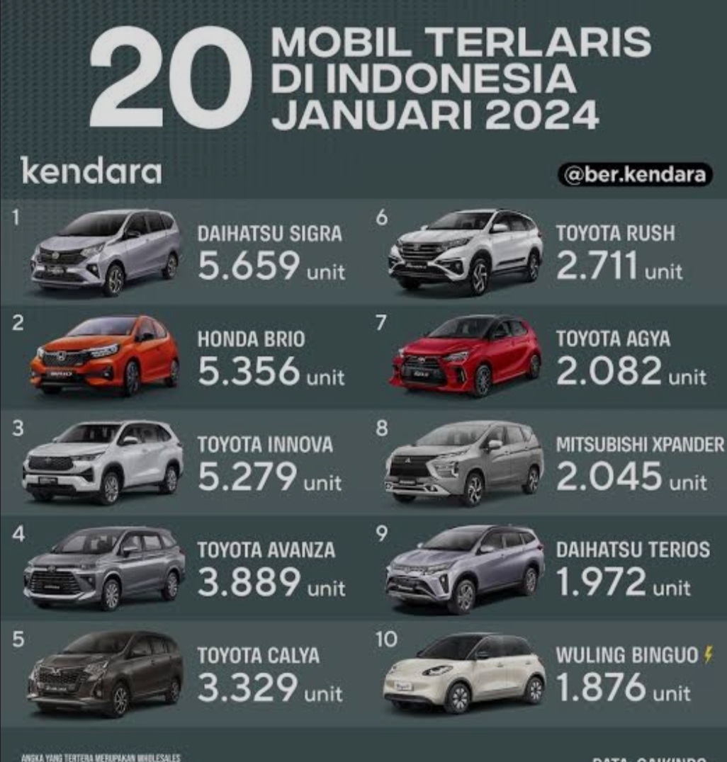 sementara toyota tetap menjadi pemain dominan dengan menguasai beberapa posisi teratas dalam daftar mobil terlaris.