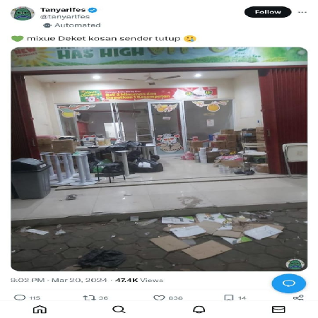 salah satu akun x @tanyarlfes membagikan postingan foto dengan cuitan “mixue deket kosan sender tutup”.