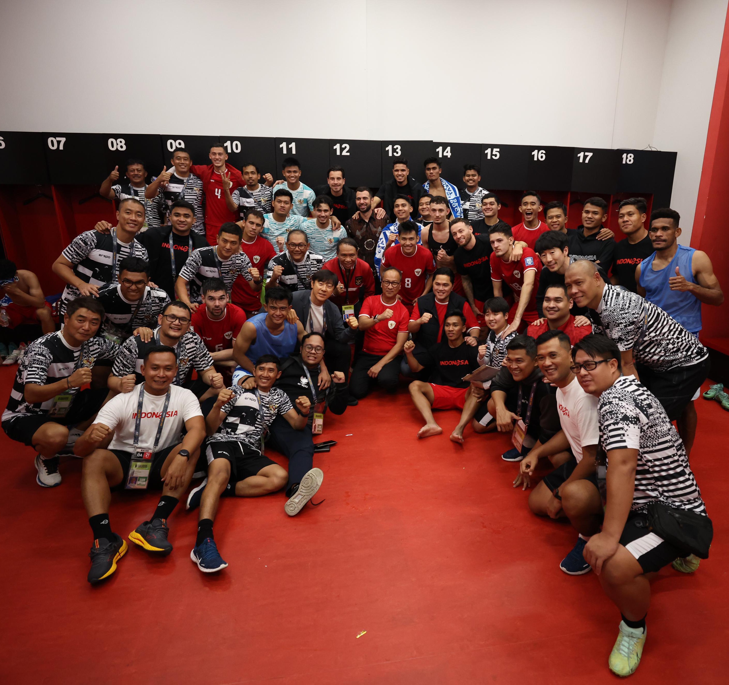 pemain dan ofisial timnas indonesia merayakan kemenangan atas vietnam di ruang ganti pemain.-pssi-