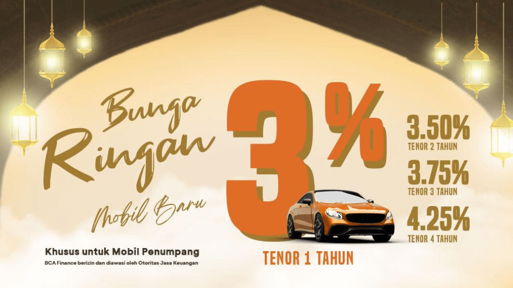 untuk kredit mobil baru di bca finance kamu akan ditawarkan dengan bunga 3% dengan tenor 1 tahun atau 12 bulan.