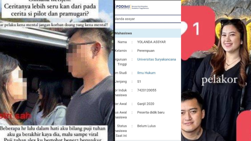 “ihhhh UNIVERSITAS SURYAKENCANA, ada mahasiswinya yg jd PELAKOR SUAMI ORG yg udh punya anak. jangan dilulusinnn, masa anak hukum gk ngerti hukumnya rebut suami orang apa hehehehe,” tulis keterangan salah satu pengguna bersamaan dengan foto Yolanda dan statusnya sebagai mahasiswi aktif.