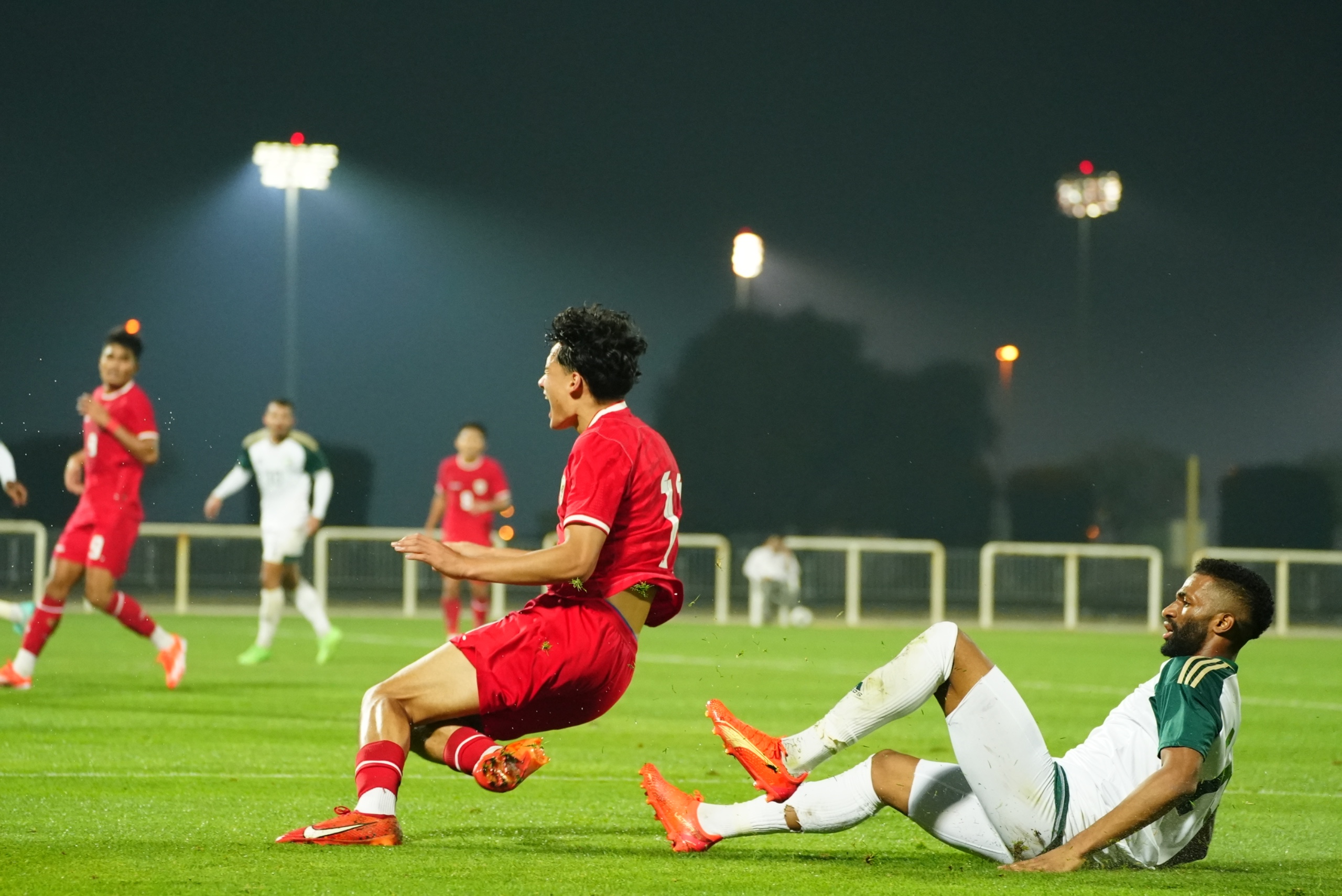Pemain Indonesia kena sliding pemain Arab Saudi dalam uji coba di Dubai. -pssi-