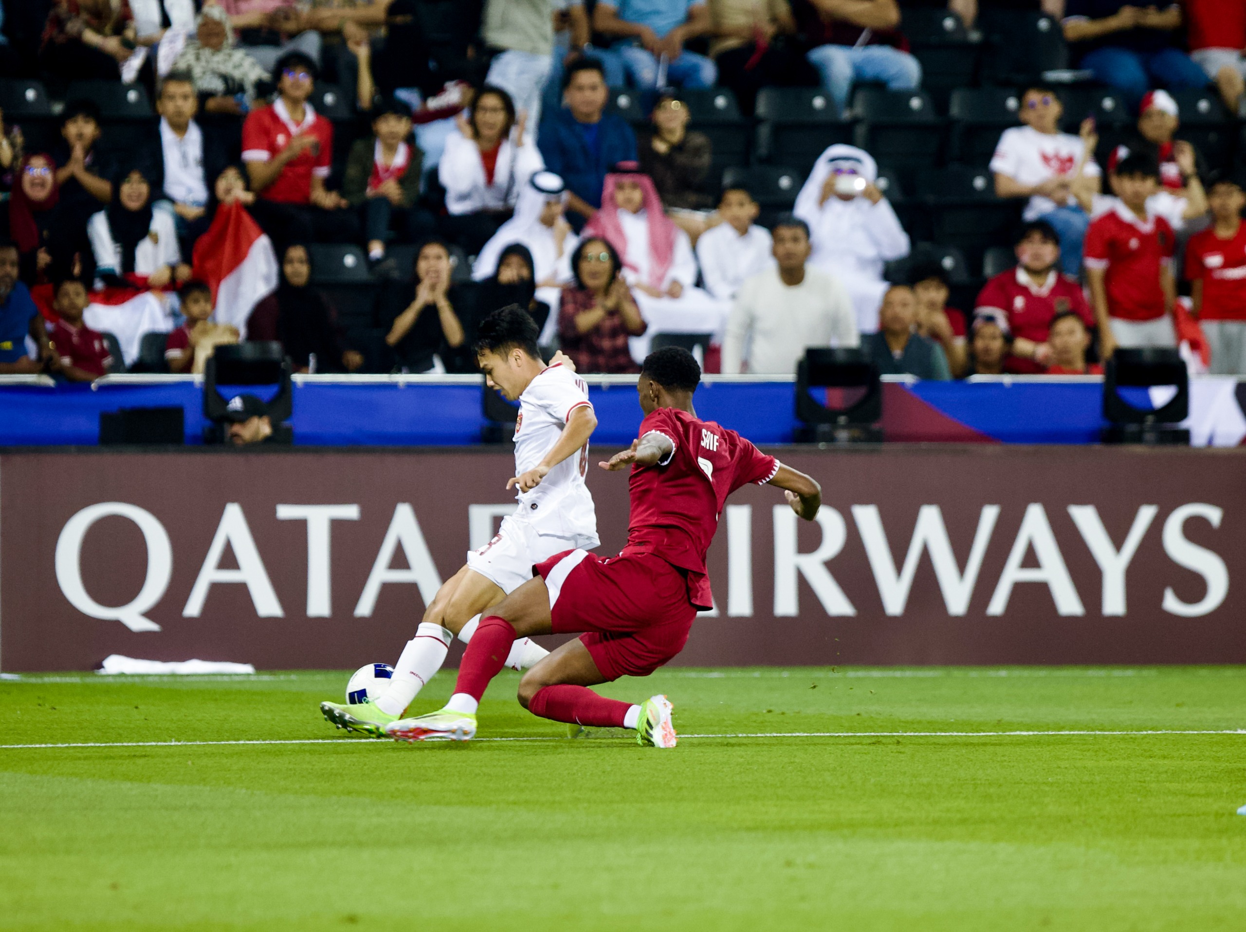muhamad ferarri (3) saat duel udara dengan pemain qatar u-23-pssi-