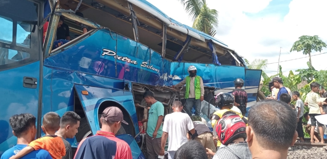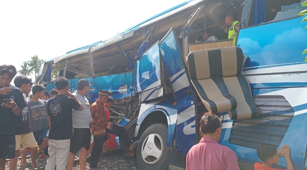 Perlintasan Tanpa Palang Pintu, Kereta Api Tabrak Bus Putra Sulung, Banyak Korban Terjepit
