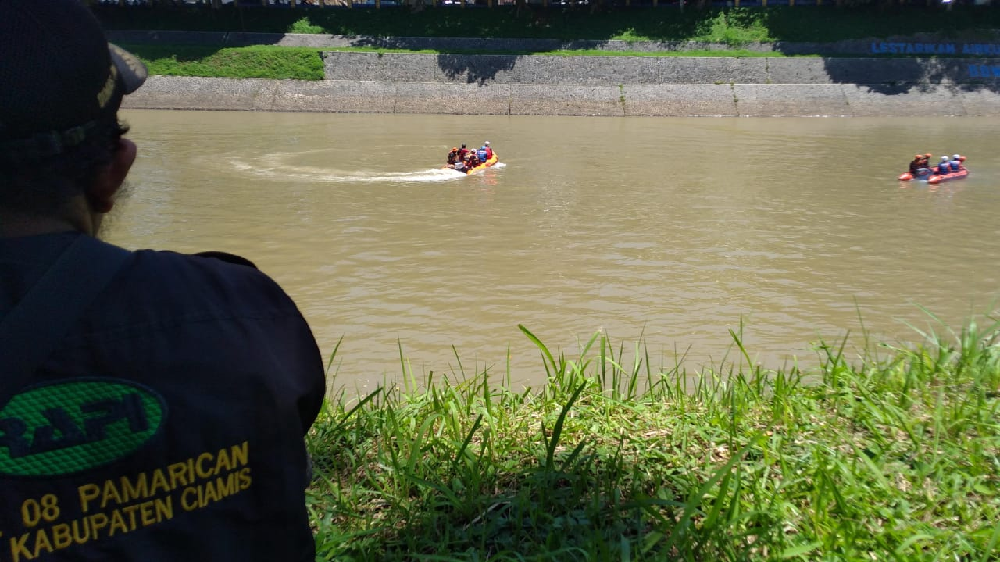 Tim penolong berupaya mencari Muhammad Iqbal Firmanto (24) yang hilang terpesosok ke sungai.