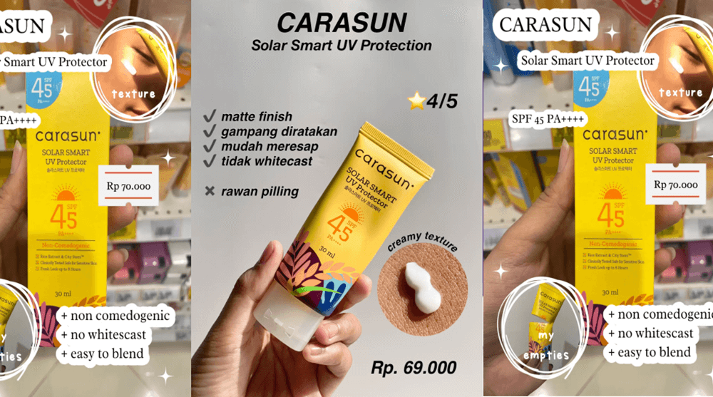 kamu bisa beli produk sunscreencarasun solar smart uv protector spf45 pa++++ di ecommerce seperti tokopedia dan shopee.