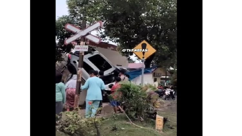 Lalu menabrak warung dan nyangkut ke dinding kantor polisi Satsamapta Polrestabes Medan.