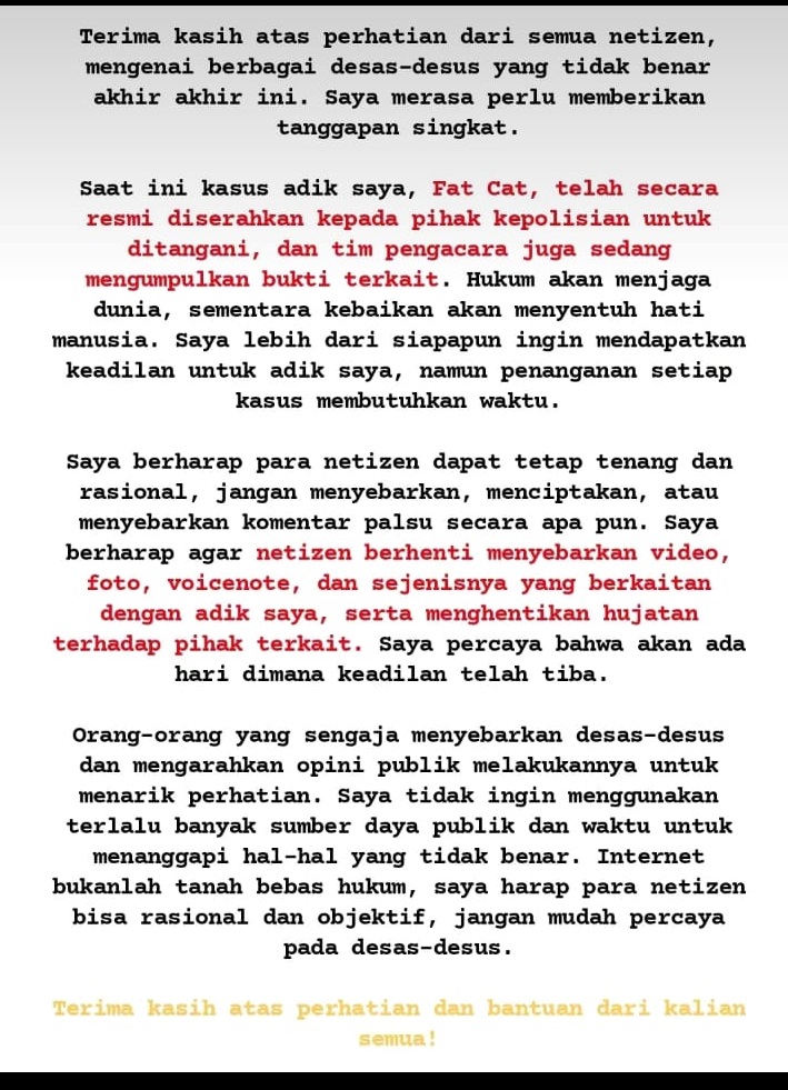 Hal ini tentu merupakan hal yang buruk dilakukan, bahkan Kakak dari Fat Cat juga berpesan agar tidak langsung mempercayai berita yang beredar luas tanpa adanya bukti.