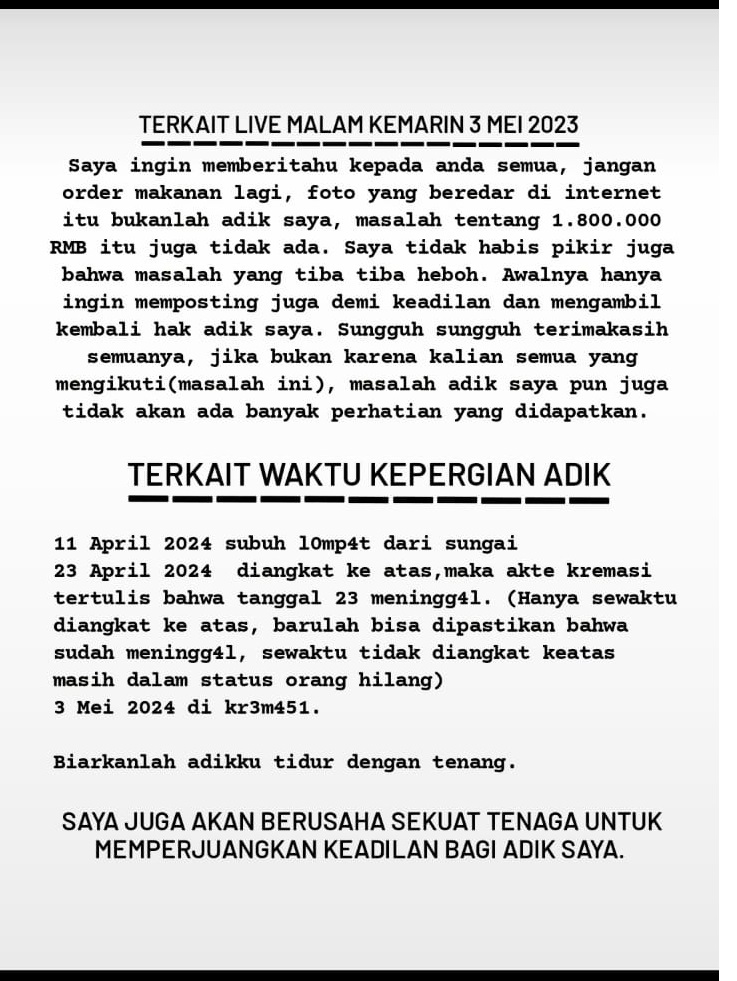 pesan tersebut di buat langsung oleh kakak korban di akun douyin pribadinya agar netizen tidak memakan berita hoax yang beredar mentah-mentah.