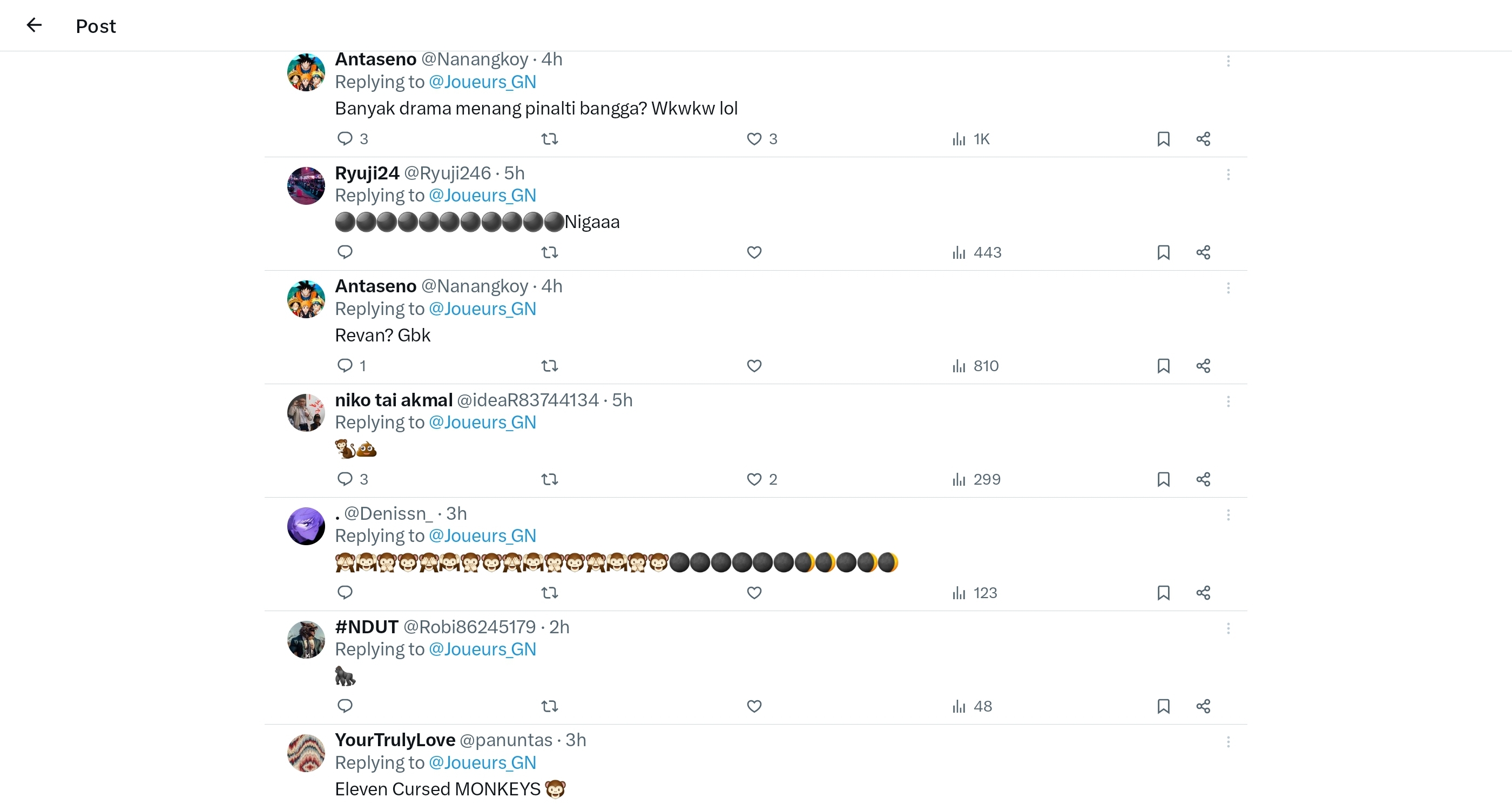 Pesan hujatan yang menyasar ke akun federasi sepak bola Guinea itu berbau rasis. Mulai dengan menyebut mereka monyet, lalu menempelkan gambar monyet. Selanjutnya ada juga yang menyebut black dan Nigga yang berarti negro.