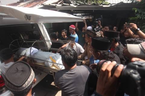 pihak keluarga tidak mempu menahan tangis setelah jenazah almarhum  tiba di rumah duka di depok, jawa barat.