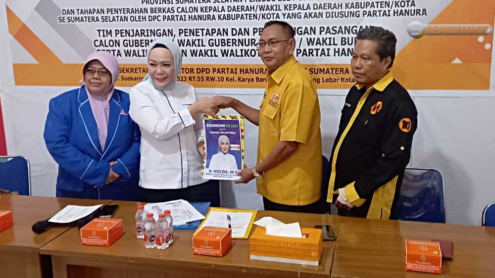Palembang ,BACAKORAN.CO - Calon gubernur wanita satu-satunya, Hj Ir Holda. MM, Kamis siang (16/5/2024), mengembalikan berkas calon gubernur Sumsel. Holda merupakan cagub kelima yang mengembalikan setelah, ESP, HA, MY dan HD. Cagub yang masih menjadi anggota DPRD aktif ini sendiri diterima sekretaris desk Pilkada Hanura, Fahmi Idris.