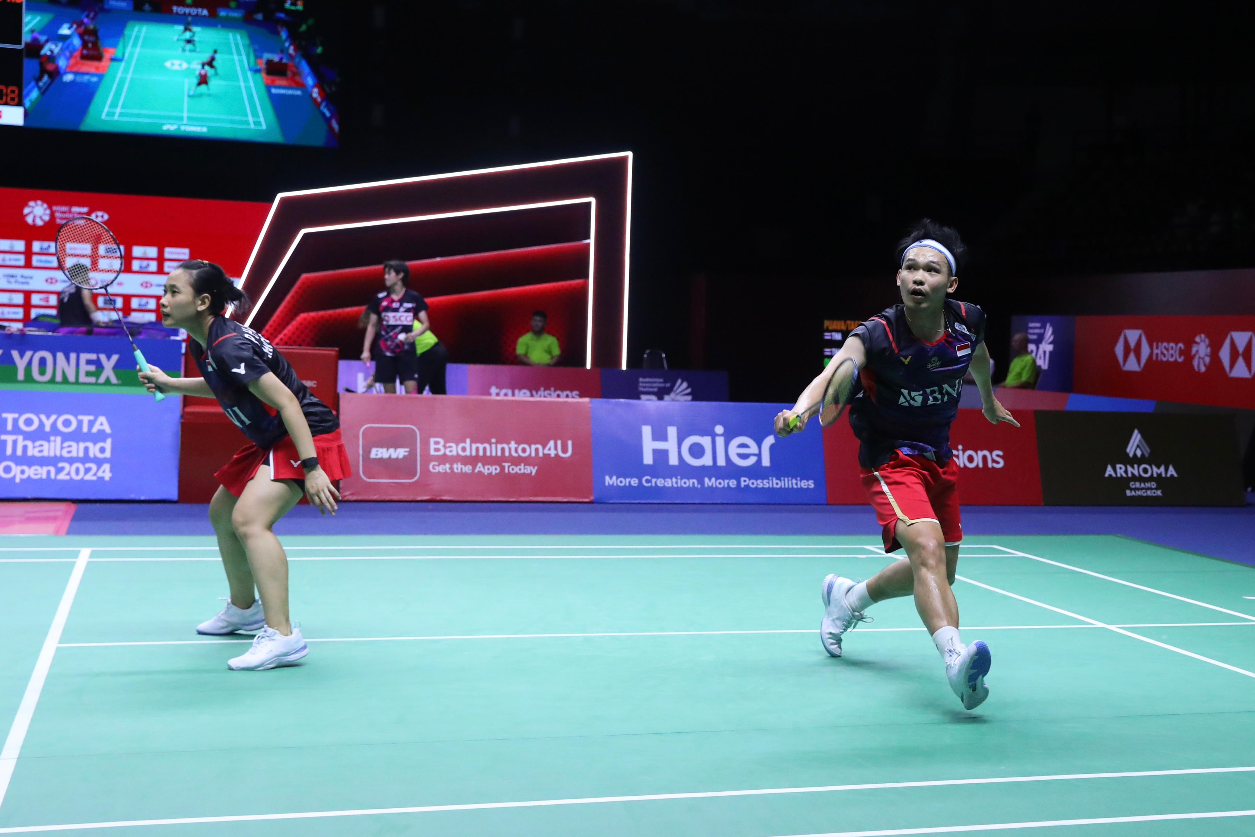 Ganda campuran Indonesia Rivaldy/Pitha Haningtyas Mentari saat berjuang di semi final Thailand Open 2024-pbsi-