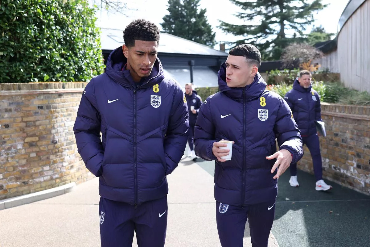Dua bintang timnas Inggris, Jude Bellingham dan Phil Foden menuju tempat latihan timnas Inggris --