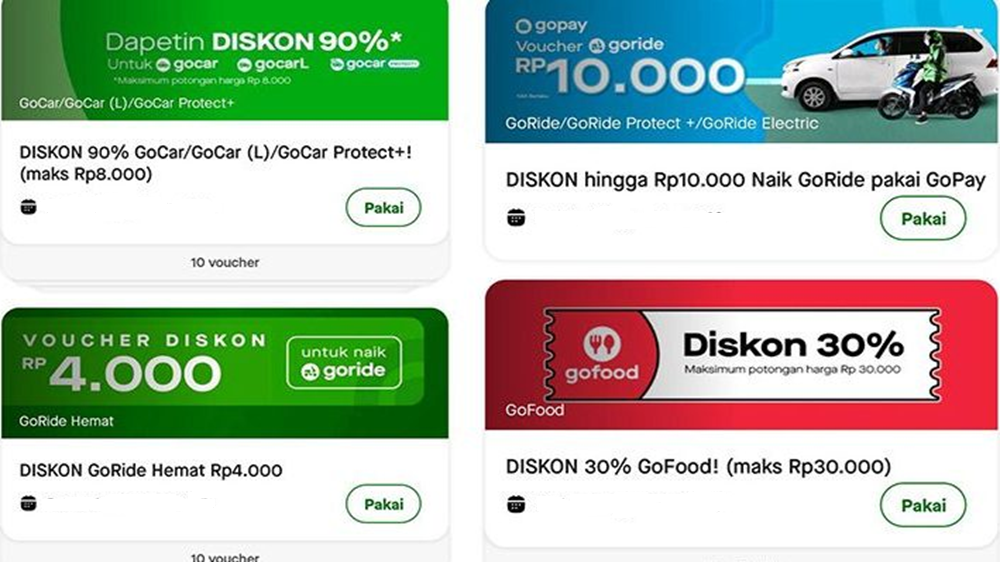 dapatkan diskon-diskon menarik dan manfaatkan layanan gojek dengan lebih hemat.