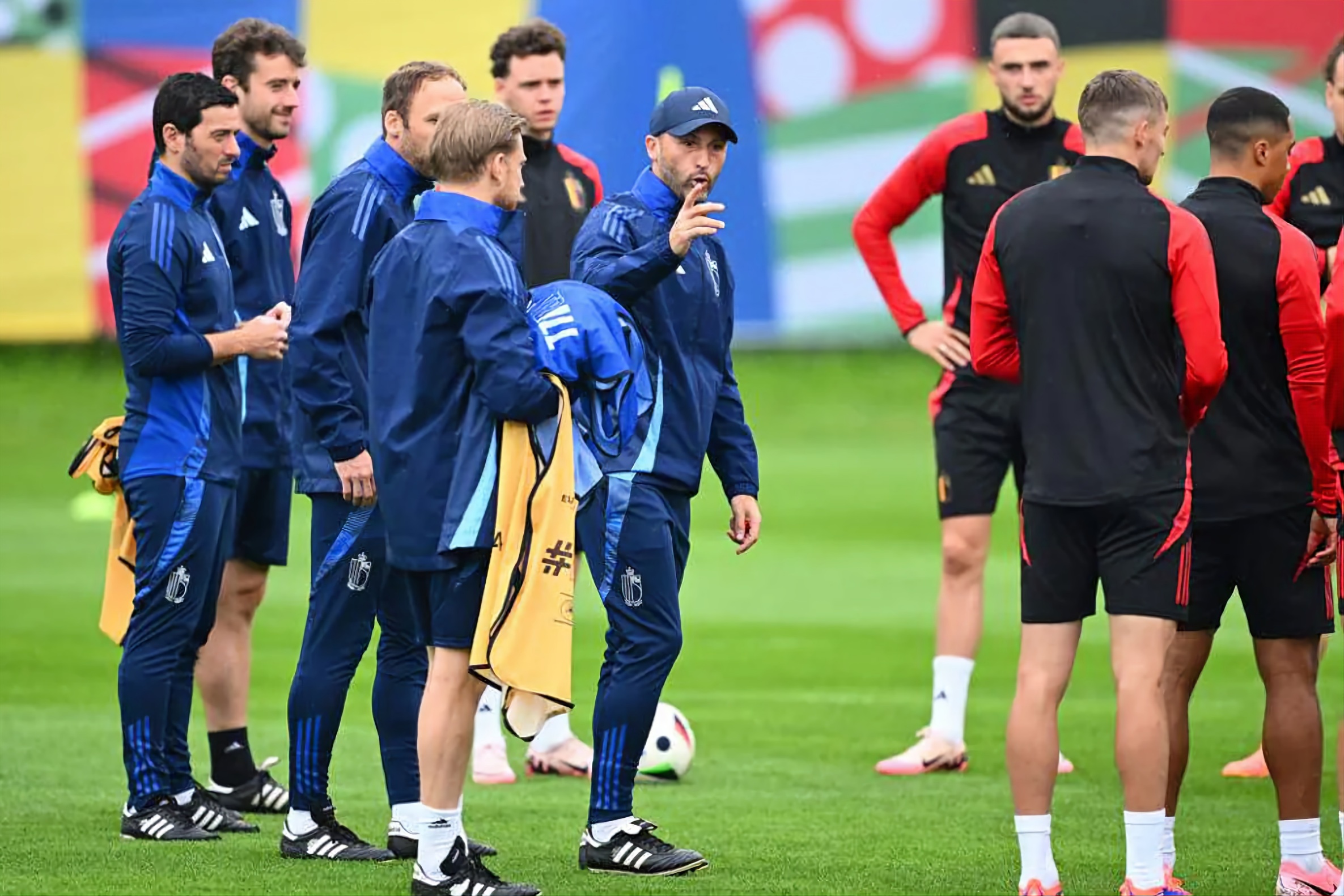 pelatih belgia domenico tedesco saat berikan arahan ke pemain di sela-sela latihan-euro2024-