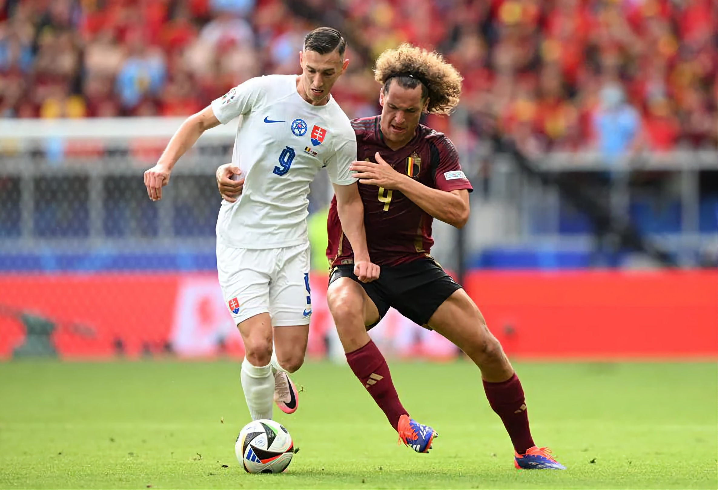 penampilan bek belgia wout faes saat melawan slovenia-euro2024-