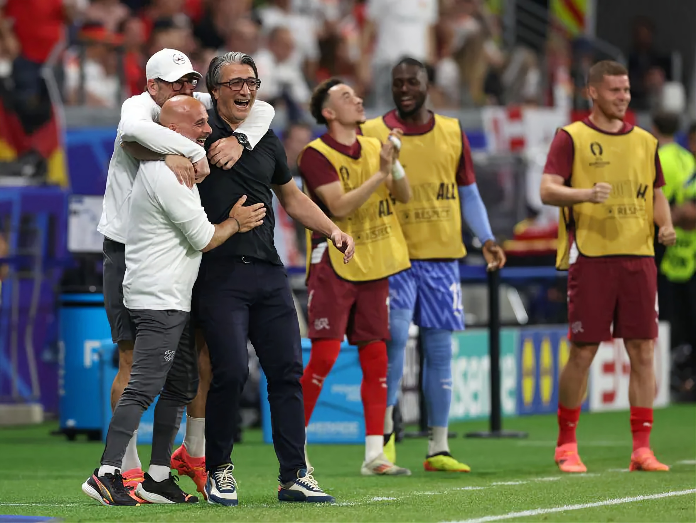 Pelatih Timnas Swiss Murat Yakin saat merayakan gol Swiss dengan asistennya. -euro2024-
