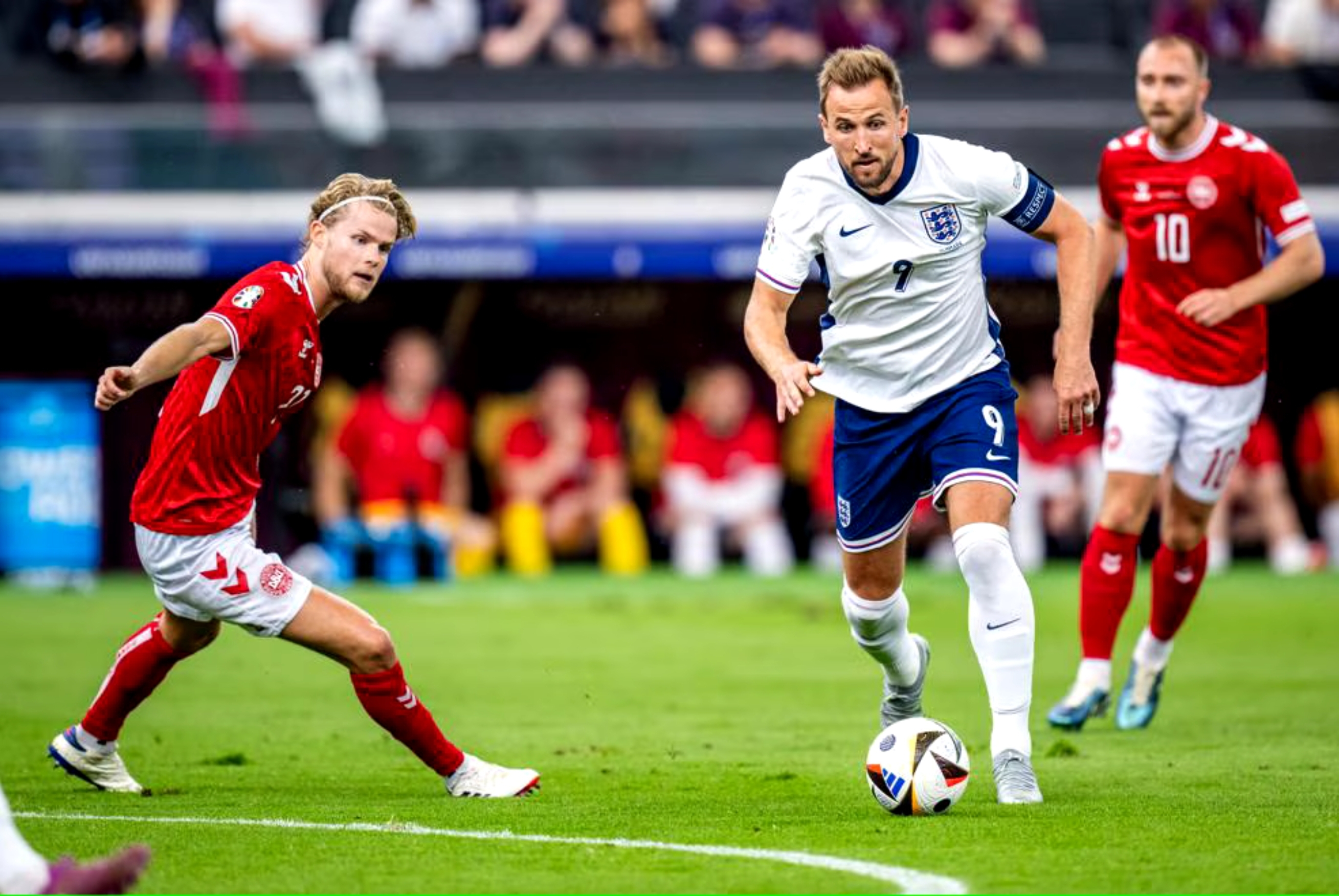 harry kane saat adu sprint dengan pemain demark. ketajamannya ditunggu saat melawan slovenia dini hari nanti-euro2024-